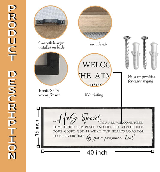 Holy Spirit You are Welcome Here Wall Decor Art 40x15 Inch Large Christian Song Bible Verse Plaque Wood Framed Sign Living Room Scripture Quote Religious For Office Wall Hanging (Wood)