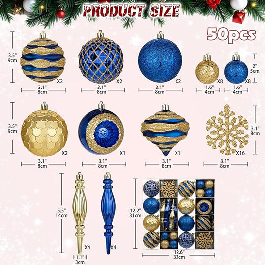Hollyone Navy Blue and Gold Christmas Balls Ornaments Set, 50pcs Large Glitter Shatterproof Christmas Snowflakes Ornaments Bulk Decoration Hanging Ball for Xmas Tree Wreath Garland Wedding Home Decor