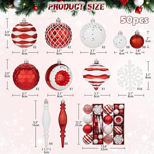 Hollyone Red and White Christmas Balls Ornaments Set, 50pcs Large Glitter Shatterproof Christmas Snowflakes Ornaments Bulk Decoration Hanging Ball for Xmas Tree Wreath Garland Wedding Home Decor