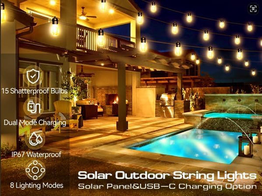Honche Solar Lights Outdoor Waterproof LED IP66 with 15 Edison Bulb Warm White String Lights Patio Lights Decorate for Christmas Camping Wedding Birthday Backyard Gazebo Party
