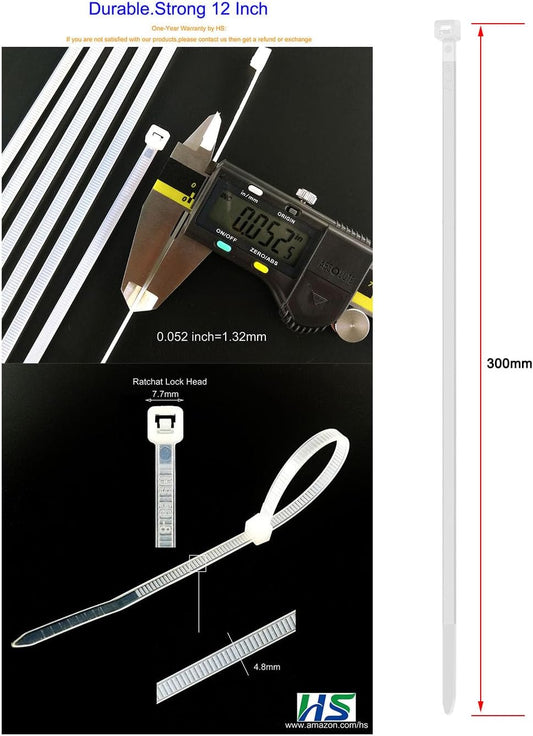 HS Long Zip Ties 12 Inch Clear 0.19" Nylon Cable Ties Heavy Duty 50 Lbs Strength Strong for Privacy Fence Outdoor,Electrical Plastic Tie Straps Weather Resistant 100 Pcs White