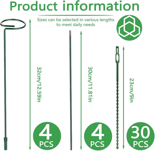 Huakaile 4 Packs Adjustable 23.6" Plant Stakes and Supports with 30 Pieces 9" Twist Ties, Green Plant Holder Stick Outdoor Indoor, Metal Flower Support Stakes Rings for Gardens Vegetables (60 cm)