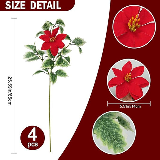 HUAESIN 4pcs Poinsettia Flowers Artificial Christmas Cemetery Flowers with Holly Leaves Faux Red Velvet Poinsettia Indoor Outdoor Long Stem Floal Arrangment for Crafts Vase Table Home Decor