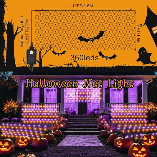 HYH Halloween Net Lights,360 LED 12FT x 5FT Halloween Decor Fairy Orange&Purple with 8 Modes String Connectable Waterproof Outdoor Lights,Hanging Light for Indoor Party Yard Garden Bushes Decorations