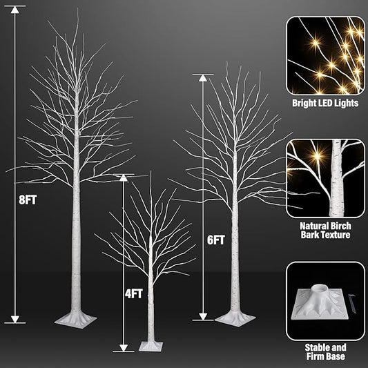 iBaycon 4FT 6FT and 8FT Birch Trees, Set of 3 Lighted Birch Tree LED Artificial Tree with 8 Modes Timer, Prelit Light Up Trees for Indoor and Outdoor Party Holiday Christmas Decorations