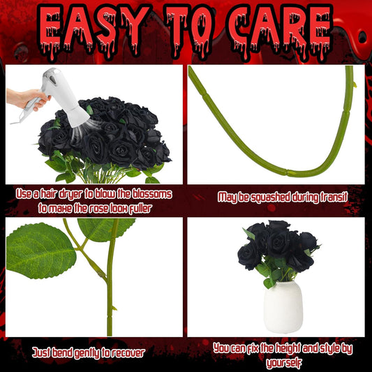 30 PCS Fake Black Roses, Artificial Flowers Bulk Halloween Decorations Realistic Silk Faux Roses with Stems for Gothic Wedding Party Decor, Bridal Bouquets DIY Floral Arrangement Home Decor