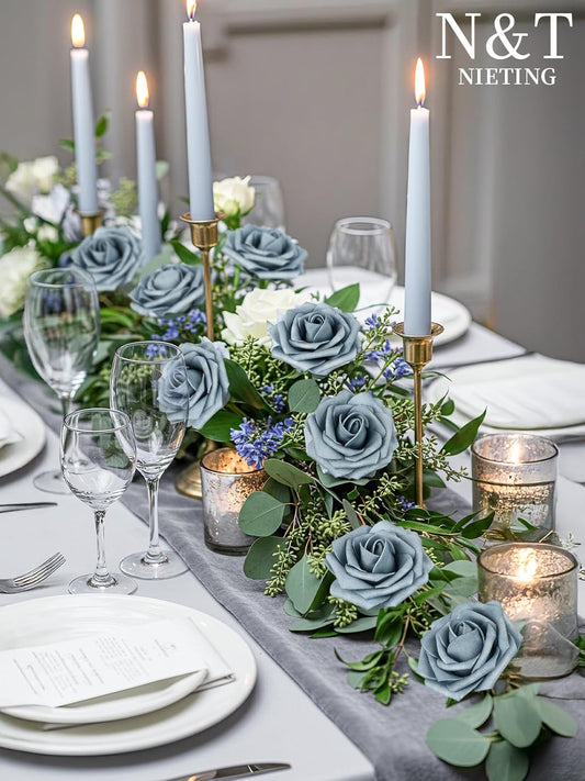 N&T NIETING Artificial Flowers, 50pcs Foam Roses Fake Flowers DIY Wedding Party Cake Decoration, Home Display, Dusty Blue Gray