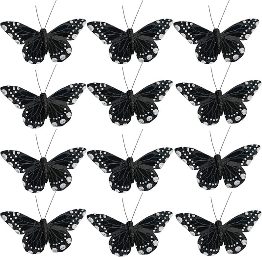 YCHTEWY- Feather Butterfly Decoration Set of 12 pcs Black Butterflies Party Decorations Halloween Decoration Home Decoration