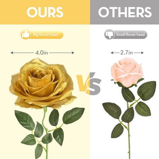 Serwalin 20pcs Artificial Gold Roses, 4'' Big Flower Head, Fake Roses Velvet Real Touch, Silk Roses Long Stems Realistic Bouquet for Wedding Parties Table Centerpiece and Home Decor