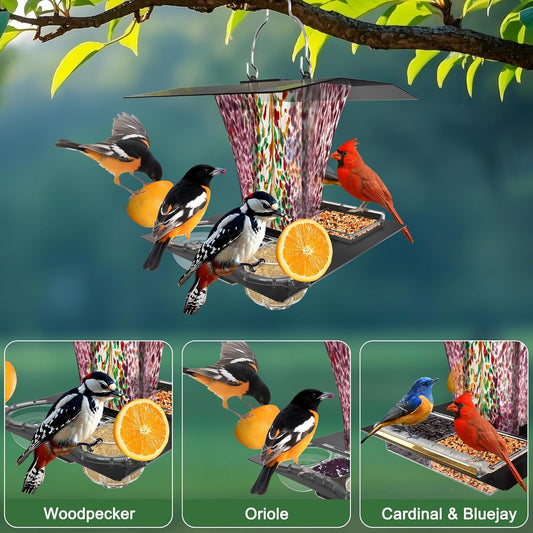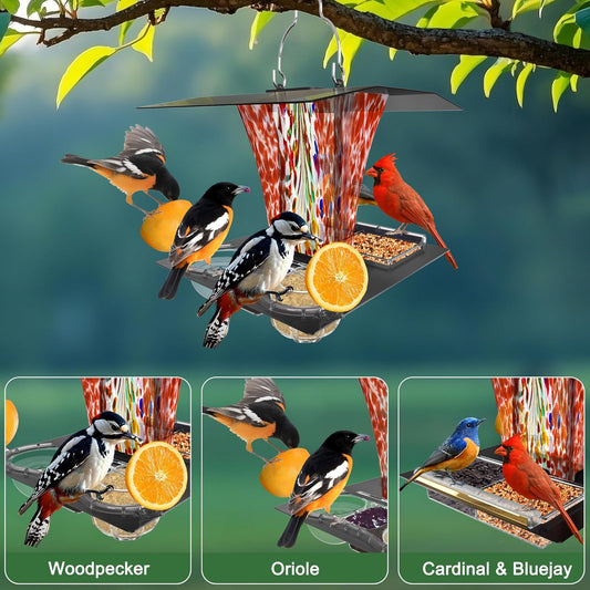 LUJII 6-in-1 Solar Bird Feeder with RGB String Lights, Hand Blown Glass, 2 Removable Trays for Bird Seed, Suet Ball, Mealworm, Oriole Orange Fruit, Jelly or Water, Red