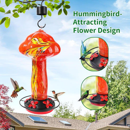 LUJII Hummingbird Feeder for Outdoors, Hand Blown Glass Humming Bird Feeder, Anti Fade Leakproof with 25 Ounces Nectar Capacity, Easy to Install Clean Refill, Include Hook & Ant Moat (Red)