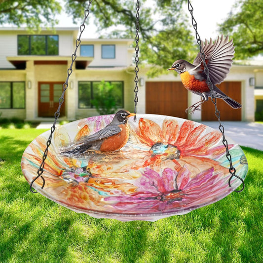 VCUTEKA Hanging Bird Bath, Glass Bird Baths for Outdoors Birdfeeder with 21 inch Rust-Proof Chain for Garden Yard Decor, Flower