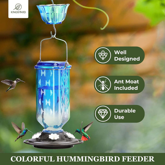 Kingsyard Hummingbird Feeder for Outdoors Hanging, 25 Ounces, Glass Humming Bird Nectar Feeder with Ant Moat & 6 Feeding Ports, Leak Proof, Turquoise