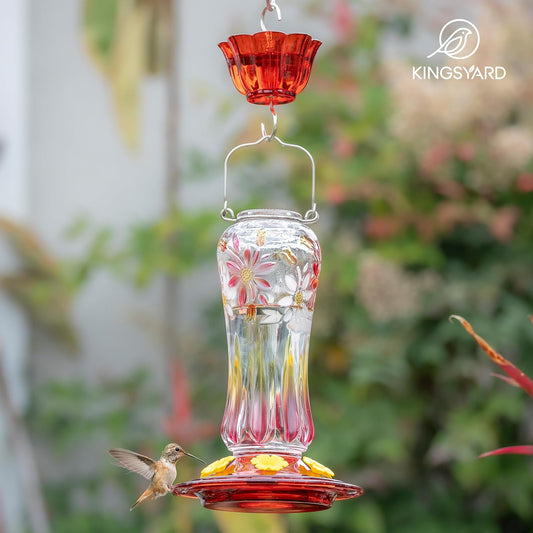 Kingsyard Glass Hummingbird Feeders for Outdoors, 24 oz Hummingbird Nectar Feeder for Outdoors Garden Porch Fall Decorations, 6 Feeding Ports, Ant Moat Included, Easy to Clean & Refill, Red