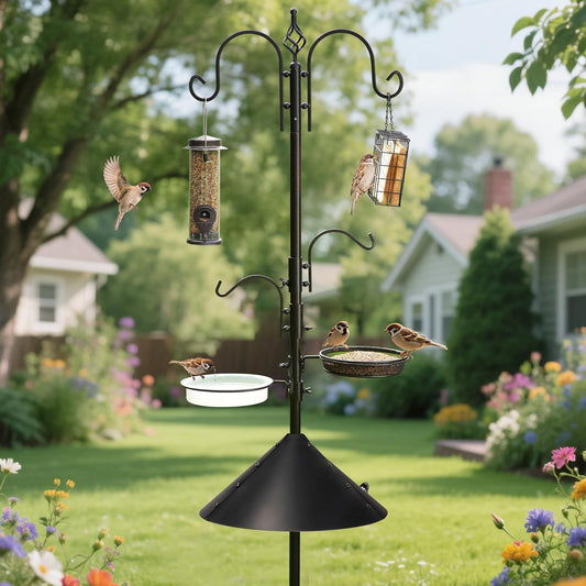 Bird Feeding Station Kit with Squirrel Baffle Bird Feeder Pole with Suet Cage Mesh Tray Fruit Hook Double W Hook for Attracting Wild Birds and Hanging Planter Hanger Lights