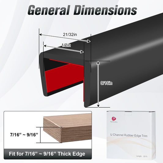 Rubber Edge Trim, Self Adhesive U Channel Edge Trim, Big Size U Shaped Trim, Edge Banding for Plywood, Woods, Shelf, Cabinet, Countertop, Fit for 1/2", Length 20Ft, Black