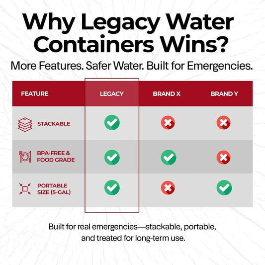 Legacy Food Storage Emergency Water Storage Containers, Long Term 5 Gallon Water Tank - 2 Stackable Food Grade Tanks Included, for Camping, Prepping, Survival - 10 Gallon Total Capacity