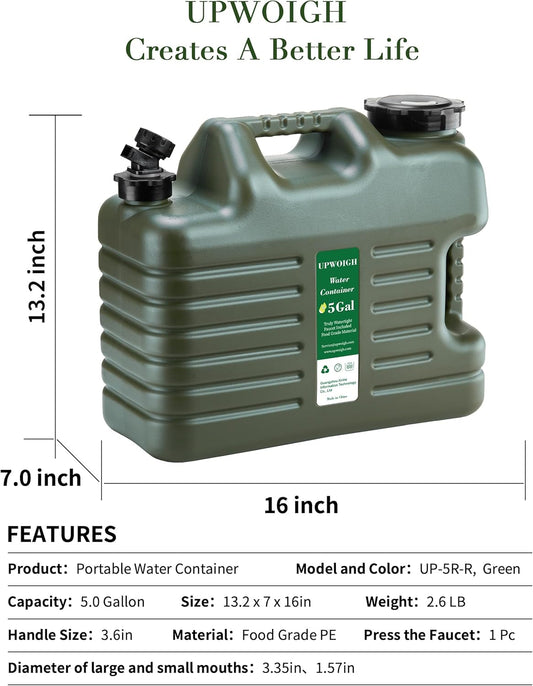 UPWOIGH 5 Gallon Water Jug, Camping Water Container, Truly No Leakage Water Storage with Spigot, Large Military Green Water Tank,BPA Free Portable Overlanding Gear for Outdoors,Hiking