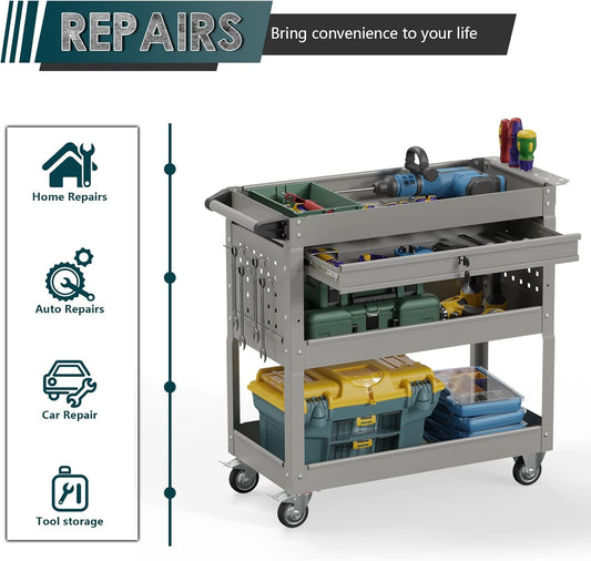 3-Tier Heavy Duty Utility Cart on Wheels, Rolling Tool Cart on Wheels with a Drawer, 350 Lbs Load Capacity Service Cart for Warehous, Garage and Repair Shop (Grey)