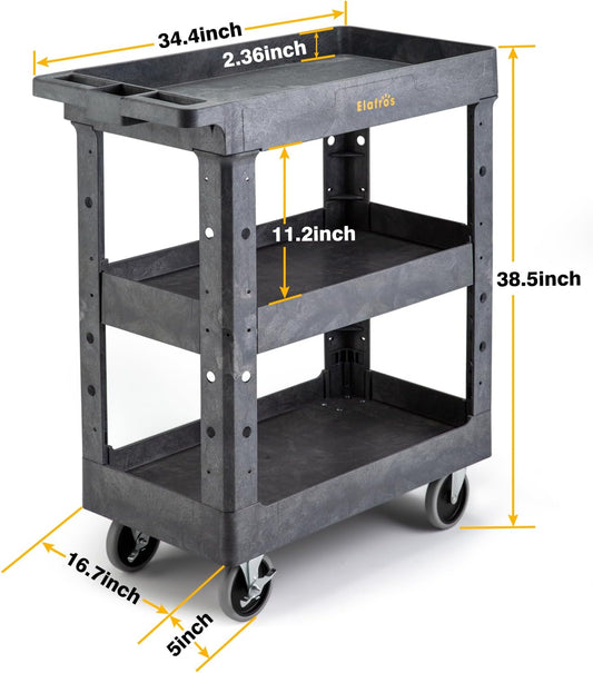 ELAFROS 3 Shelf Heavy Duty Plastic Utility Cart 34 x 17 x 38.5 Inch - Work Cart with 2 Fixed 2 Swivel Wheels and Safely Holds up to 550 lbs - 3 Tier Service Cart Deep Shelves Tool cart, Gray