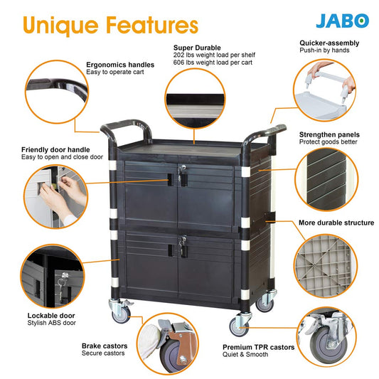 JaboEquip Double Lockable Door Medical Cart [ JaboEquip ] Cabinet Utility Cart with 2 Lockable Doors for Hospitality School Lab cart Service Cart, L34.43xD19.69 inch JABO cart, Black