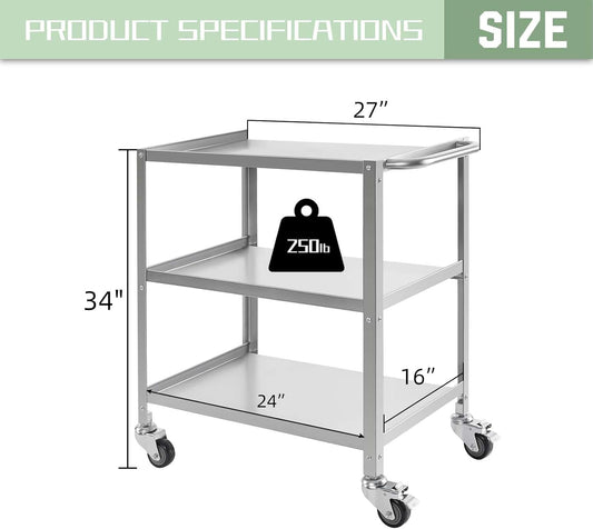 Hally Stainless Steel Utility Cart 3 Tier NSF Commercial Heavy Duty Metal Mobile Food Rolling Cart with Handle and Wheels for Kitchen, Restaurant, Hospital, Laboratory and Home, 24" L x 16" W x 34" H