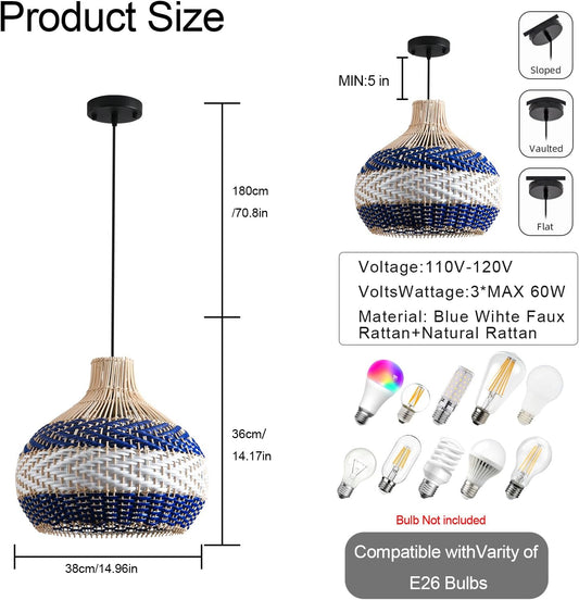 3-Light Rattan Pendant Light 15" Hand-Woven Blue White Wicker Basket Chandelier Boho Faux Rattan Hanging Light,for Living Room Bedroom Kitchen Hallway Dining Farmhouse 1-Pack