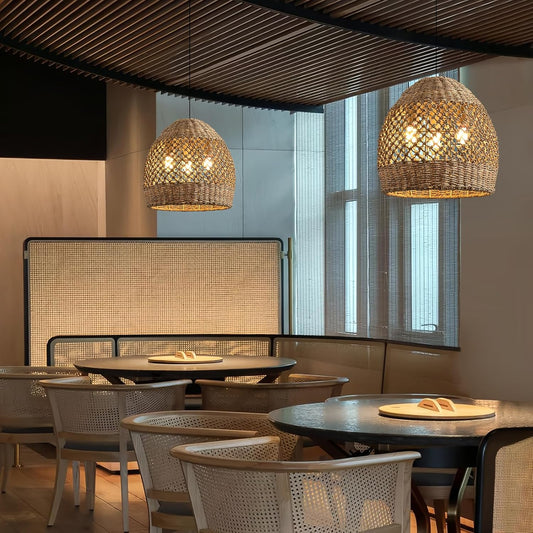 Boho Pendant Lights Kitchen Island, 11.8" Hand-Woven Rattan Light Fixture Bohemian Lighting Farmhouse Seagrass Weaving Hanging Ceiling Light Chandelier for Living Dining Room Restaurants