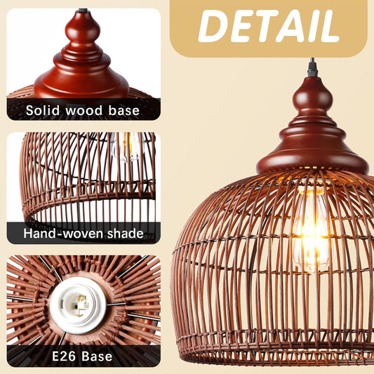 Arturesthome 19.6" Retro Rattan Woven Pendant Light Fixture, Chandelier with Lamp Shade Light Cover, Hanging Lighting for Kitchen Dining Room Foyer