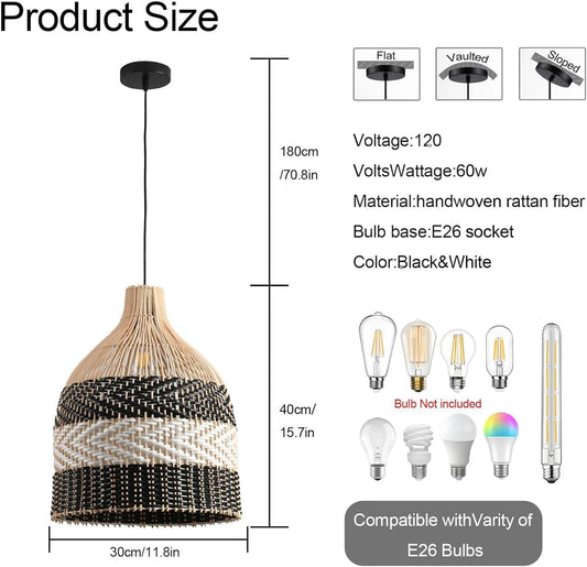 11.8" Rattan Pendant Light 1-Pack Black White Faux Rattan Basket Chandelier Boho Handmade Woven Oval Wicker Hanging Light Fixture for Public Place Dining Living Bedroom Kitchen