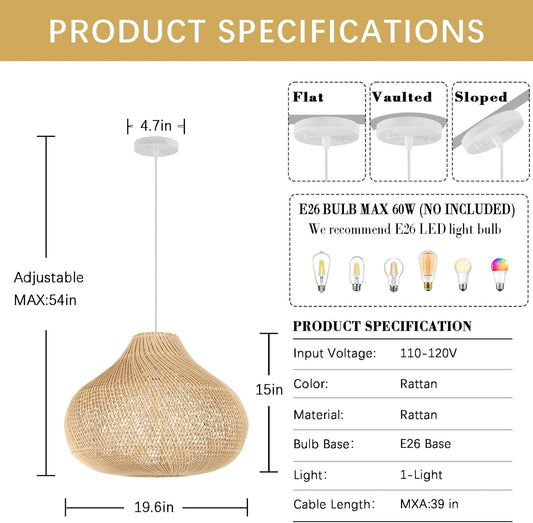 Large Rattan Pendant Light, 19.7" Rattan Boho Wicker Chandelier Hand-Woven Basket Pendant Light Fixtures for Dining Room Kitchen Island Living Room