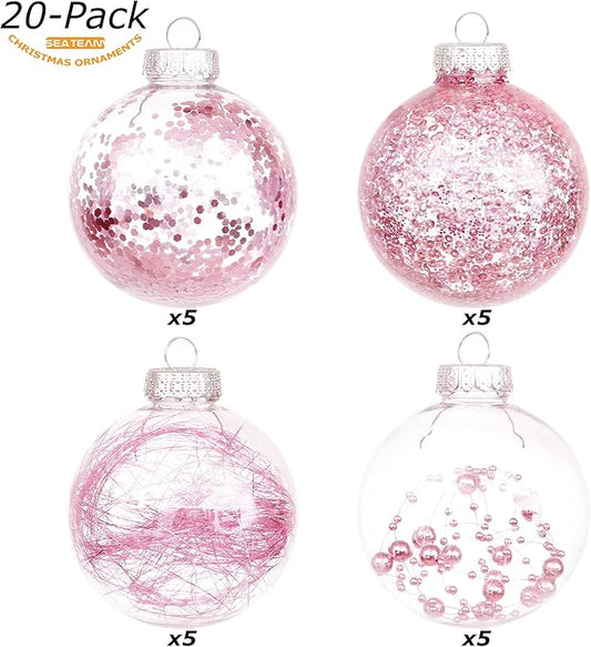 Sea Team Shatterproof Clear Plastic Christmas Ball Ornaments Decorative Xmas Balls Baubles Set with Stuffed Delicate Decorations (80mm/3.15 inch 20-Pack, Pink)