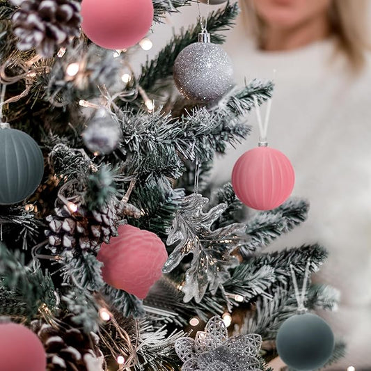 KI Store Velvet Christmas Balls Rose Pink 25pcs Flocked Christmas Tree Ornaments Assortment for Xmas Tree Holiday Decor