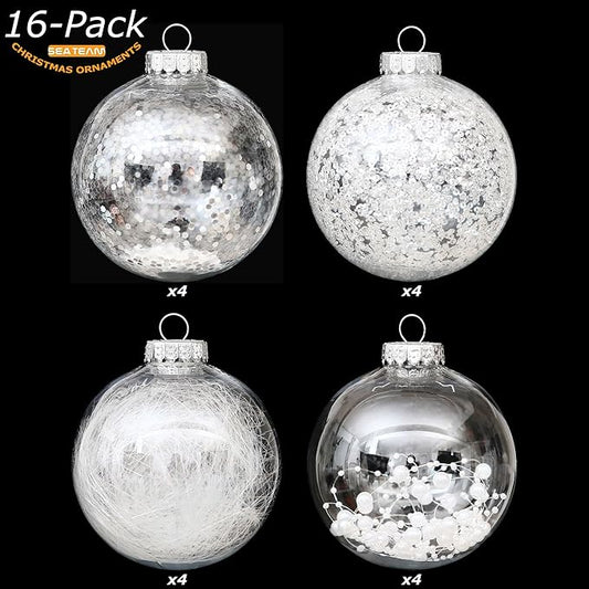 Sea Team Shatterproof Clear Plastic Christmas Ball Ornaments Decorative Xmas Balls Baubles Set with Stuffed Delicate Decorations (100mm/3.94 inch 16-Pack, Silver)