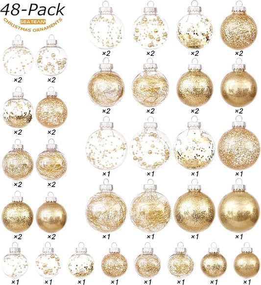 Sea Team Multi-Size Shatterproof Clear Plastic Christmas Tree Ball Ornaments Set, Decorative Hanging Transparent Xmas Baubles with Stuffed Delicate Decorations (48 Counts, Gold)