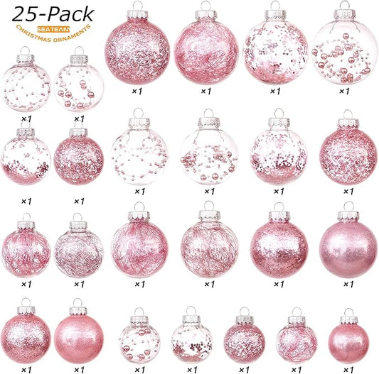 Sea Team Christmas Baubles Set, Shatterproof Clear Plastic Christmas Baubles Multi-Size Decorative Baubles with Stuffed Delicate Decorations (25 Pieces, Pink)