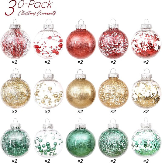 Sea Team 60mm/2.36" Shatterproof Clear Plastic Christmas Tree Ball Ornaments Set, Decorative Hanging Transparent Xmas Baubles with Stuffed Delicate Decorations (30 Counts, Gold, Red, Green)