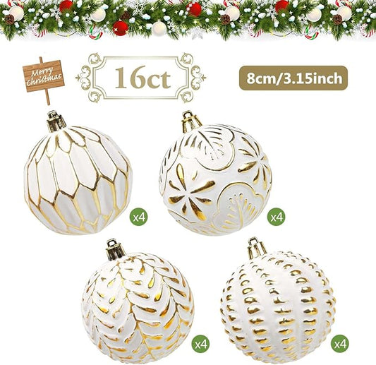 Christmas Ball Ornaments Set, 16ct 80mm Elegant White and Gold Assorted Xmas Tree Ball Ornaments, Shatterproof Christmas Tree Hanging Ornaments for Xmas Decoration