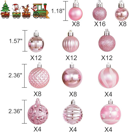 100PCS Christmas Ball Ornaments, Assorted Shatterproof Christmas Tree Decorations, Seasonal Decorative Hanging Baubles Decor Set for Xmas/Holiday/Party, Glitter&Painting Ornament Set (Pink)
