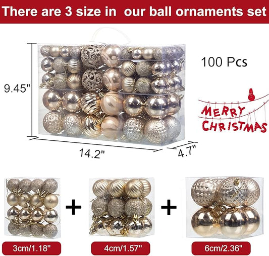 100PCS Christmas Ball Ornaments, Assorted Shatterproof Christmas Tree Decorations, Seasonal Decorative Hanging Baubles Decor Set for Xmas/Holiday/Party, Glitter&Painting Ornament Set (Champagne)