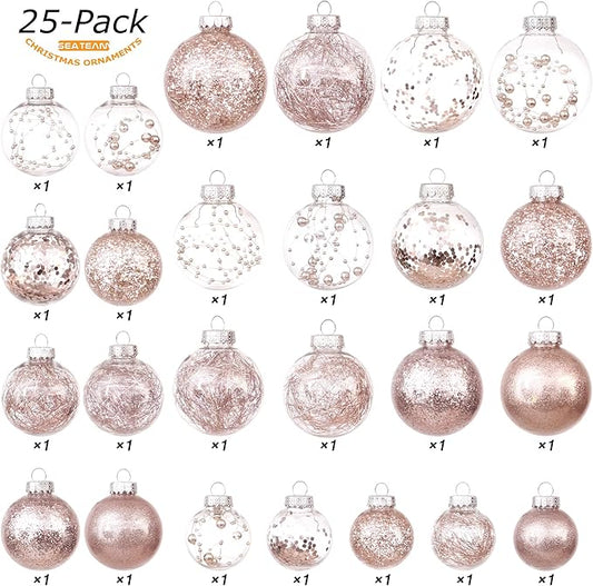 Sea Team Multi-Size Shatterproof Clear Plastic Christmas Tree Ball Ornaments Set, Decorative Hanging Transparent Xmas Baubles with Stuffed Delicate Decorations (25 Counts, Rose Gold)