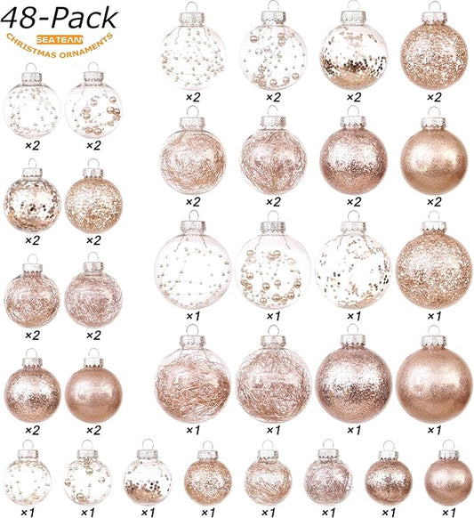 Sea Team Christmas Baubles Set Clear Plastic Shatterproof Multi-Size Decorative Christmas Balls with Stuffed Delicate Decorations (48 Pieces, Rose Gold)