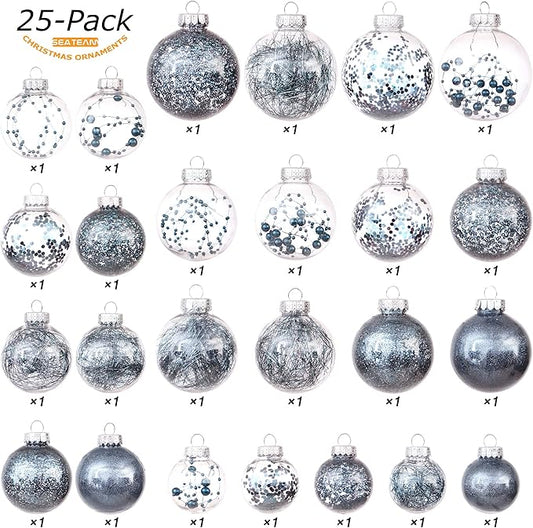 Sea Team Multi-Size Shatterproof Clear Plastic Christmas Tree Ball Ornaments Set, Decorative Hanging Transparent Xmas Baubles with Stuffed Delicate Decorations (25 Counts, Stone Blue)