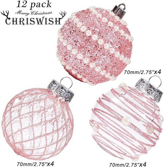 12CT Christmas Ball Ornaments Pink Shatterproof Clear Large Plastic Christmas Tree Decoration, Delicate Hanging Ornaments for Xmas Party, Wedding, Holiday and Home Décor(70mm/2.76")