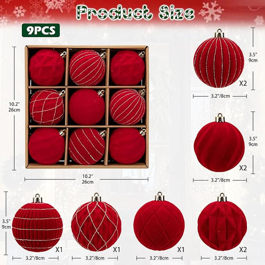 Hollyone Red Velvet Christmas Ornaments Set for Christmas Tree 3.2inch Xmas Ball Ornaments 9Pcs Flocked Balls Xmas Tree Hanging Ornament Decoration Set Shatterproof for Holiday Party Wreath Home Decor