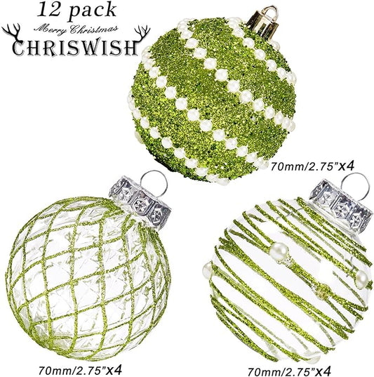 12CT Christmas Ball Ornaments Green Shatterproof Clear Large Plastic Christmas Tree Decoration, Delicate Hanging Ornaments for Xmas Party, Wedding, Holiday and Home Décor(70mm/2.76")