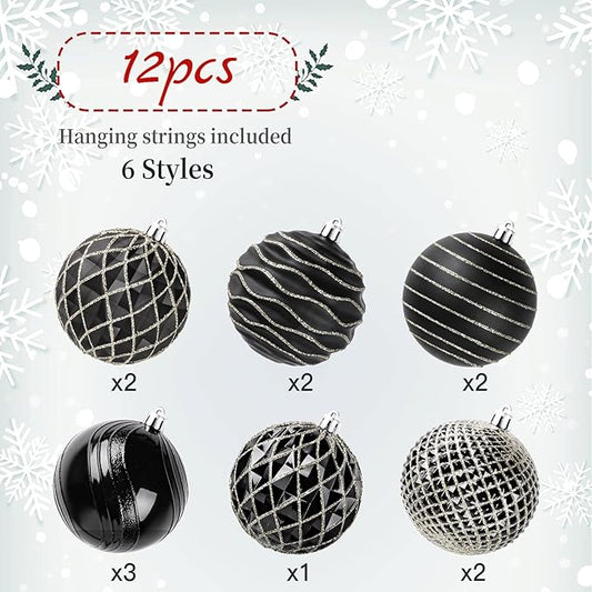SHareconn 80mm Christmas Balls Ornaments,12PCS Colored Shatterproof Plastic Decorative Hanging Tree Decorations Baubles Set for Xmas Tree Decor Holiday Party Wedding Decoration with Lanyard,Black&Gold