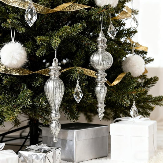 DN DECONATION Mercury Glass Finial Christmas Ornaments, Large Hanging Teardrop Ornament, Shiny Ball Ornaments for Xmas Tree, Winter Wedding, Party, Holiday Home (4-Pieces, Silver)