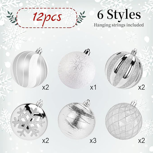 SHareconn 80mm Christmas Balls Ornaments,12PCS Colored Shatterproof Plastic Decorative Hanging Tree Decorations Baubles Set for Xmas Tree Holiday Party Wedding Decoration with Lanyard, Silver&White