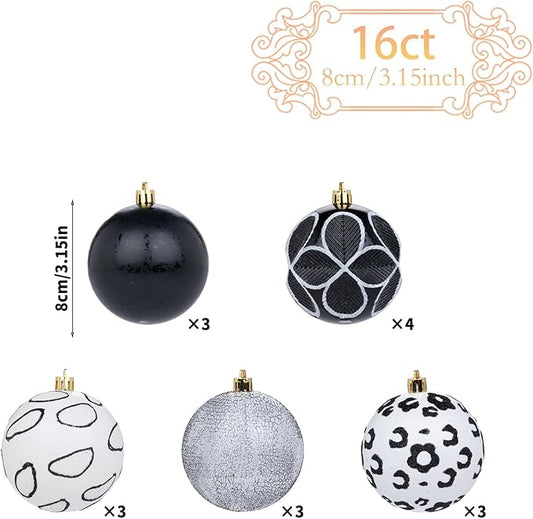 16CT Leopard Christmas Ornaments,Shatterproof Black and White Christmas Decorations, Lage Baubles Ornaments Hanging Decor for Xmas Tree Home Party Festivals (80MM/3.15'')